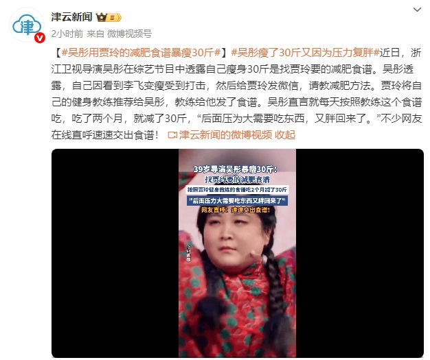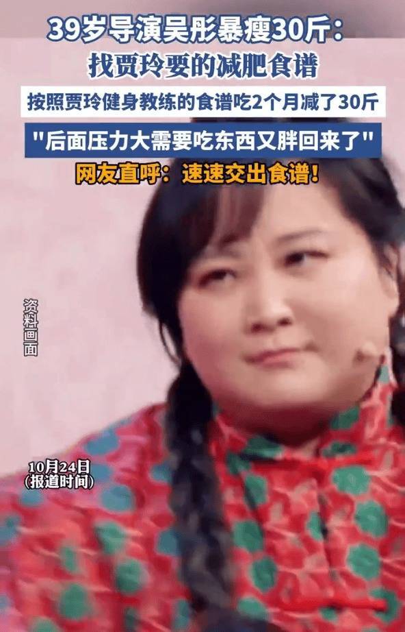 近日,浙江卫视导演吴彤在综艺节目中透露自己瘦身30斤是找贾玲要的减肥食谱。吴彤透露,自己因看到李飞变瘦受到打击,然后给贾玲发微信,请教减肥方法。贾玲将自己的健身教练推荐给吴彤,教练给他发了食谱。吴彤直言就每天按照教练这个食谱吃,吃了两个月,就减了30斤,“后面压力大需要吃东西,又胖回来了。”不少网友在线直呼速速交出食谱!